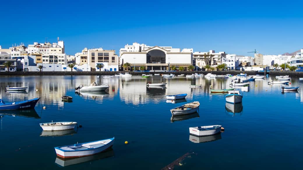 Enjoy one of the many restaurants lining the small fishing port connected to the Atlantic Ocean, for a quiet moment while passing through Arrecife (free visit).